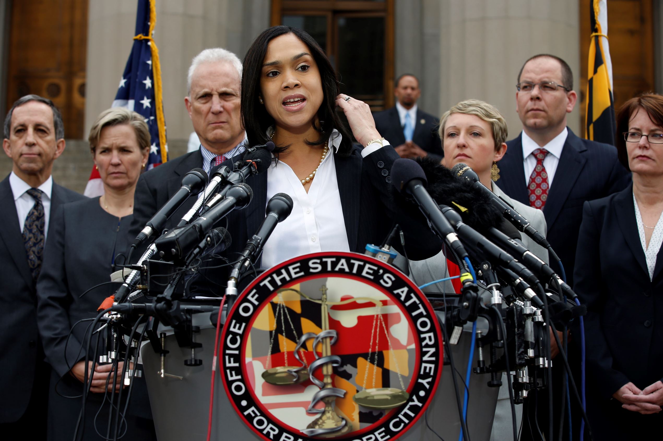 Six Baltimore police officers have been charged, including one with murder, in the death of a black man who was arrested and suffered a fatal neck injury while riding in a moving police van, the city’s chief prosecutor said on Friday.