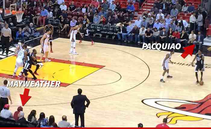 Floyd Mayweather and Manny Pacquiao are both at the Miami Heat game RIGHT NOW — sitting across the court from each other